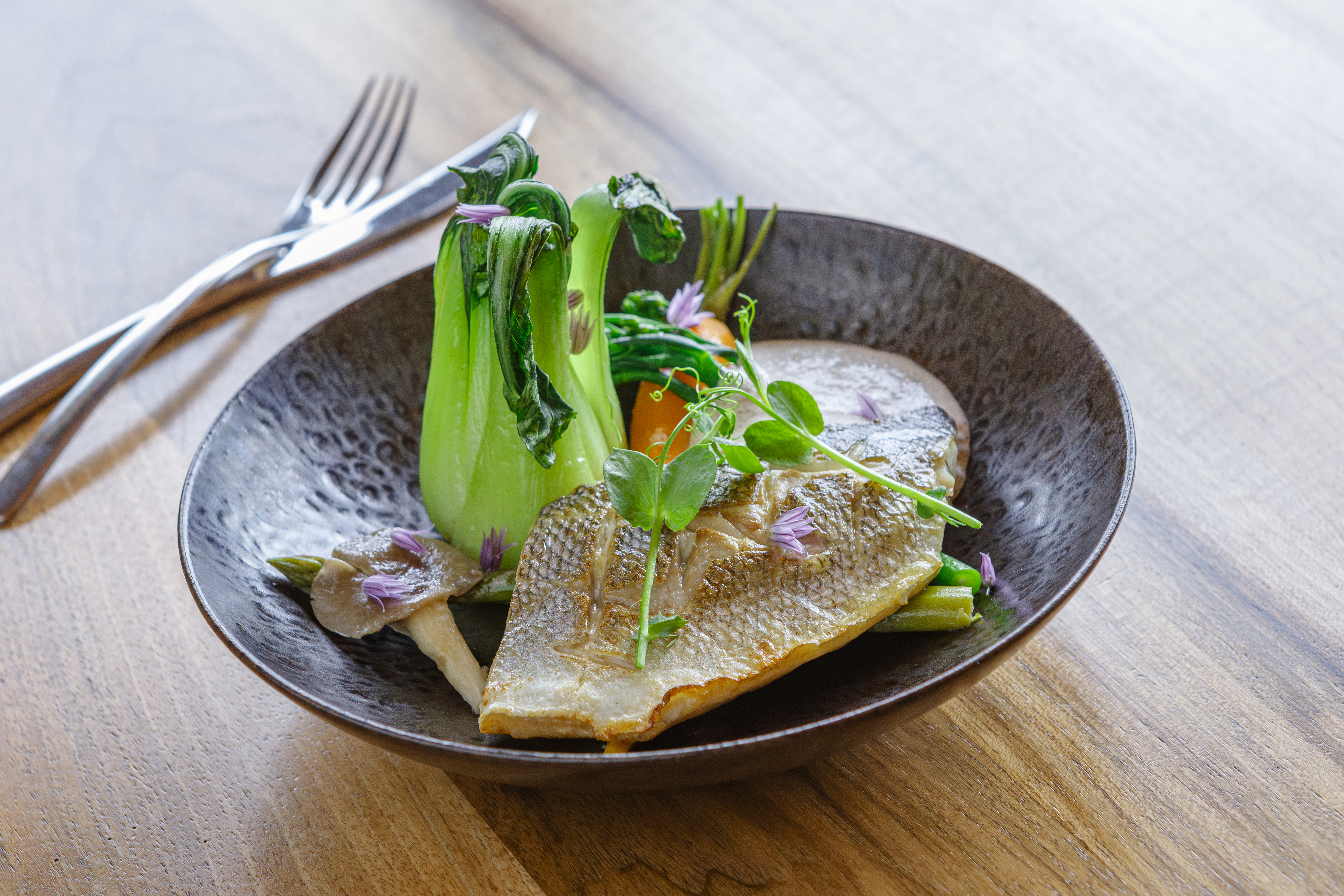Inscrit au coeur de la Bretagne et du Finistère, le restaurant des Jardins de l’Éveil propose une cuisine inspirée de la cuisine bretonne, faite de produits frais de la terre et de la mer, en puisant directement les ingrédients dans les jardins, le potager, le verger et les herbes aromatiques du parc.